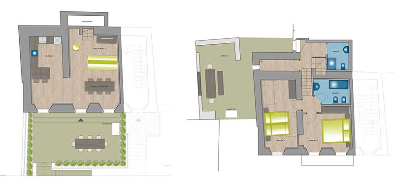 Auf der Zwischenebene befindet sich der Ausgang für den schönen Innenhof mit Zugang zum alten Ortskern. Sie können dort auf der alten Natursteinmauer sitzen – wir haben einen Klapptisch und eine Holzbank dazu aufgestellt. Gerade bei heißen Temperaturen werden Sie den Gartenhof bestimmt besonders schätzen!